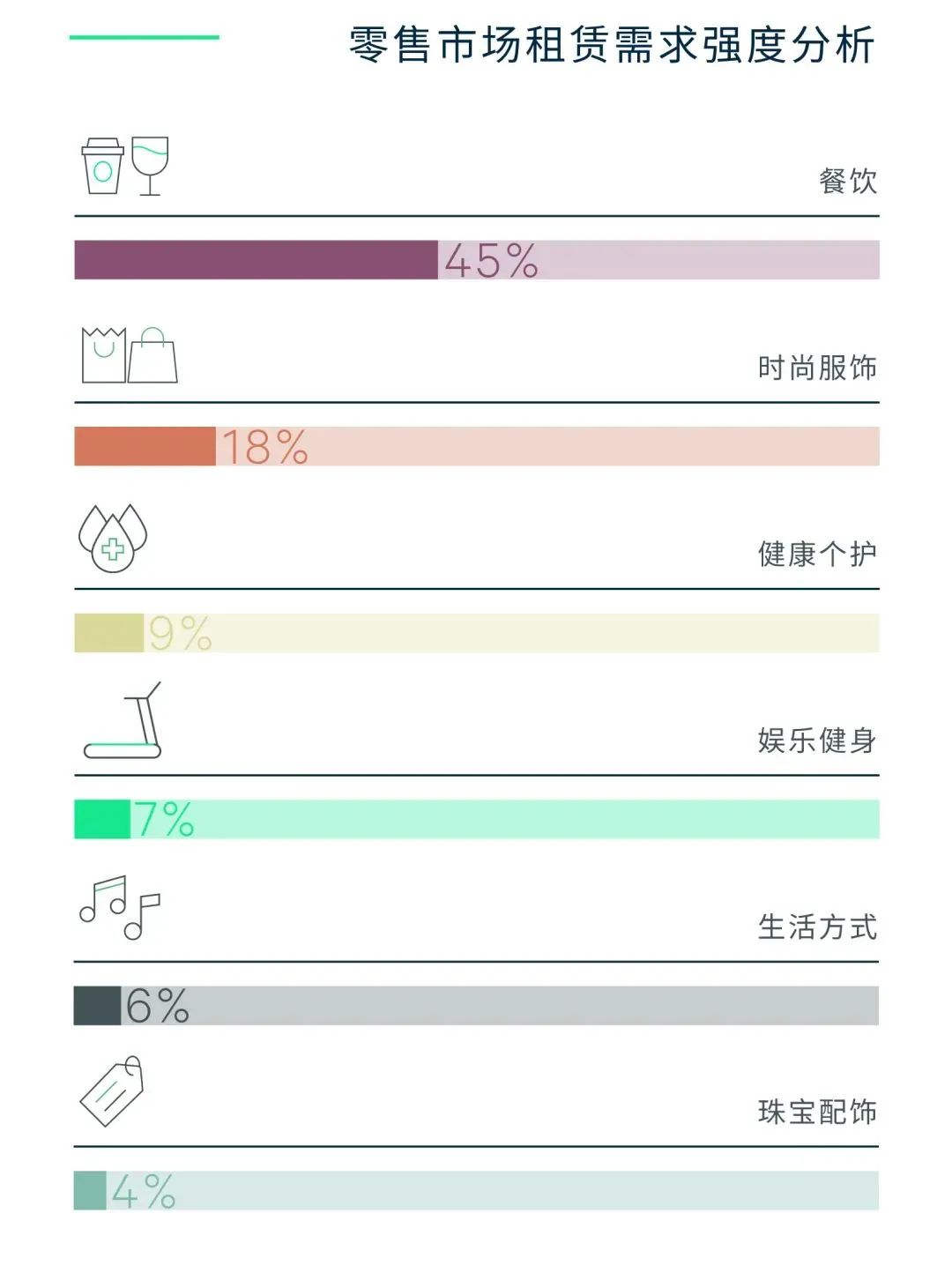在業(yè)態(tài)擴(kuò)張方面,餐飲依舊是主要驅(qū)動力,需求占比45%,其中以咖啡茶飲和亞洲食肆品類需求特別亮眼。