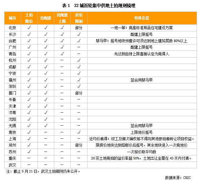 盡管大部分城市都采取了雙重限價(jià)等措施,但結(jié)合已完成首輪土拍城市表現(xiàn)來(lái)看,仍有不少城市出現(xiàn)了競(jìng)拍高熱現(xiàn)象。因此,在“三穩(wěn)”要求進(jìn)一步落實(shí)的背景下,重慶、杭州、無(wú)錫等首輪土拍高熱城市極有可能會(huì)在二三批次供地時(shí)對(duì)出讓規(guī)則進(jìn)行升級(jí),以穩(wěn)定市場(chǎng)預(yù)期。