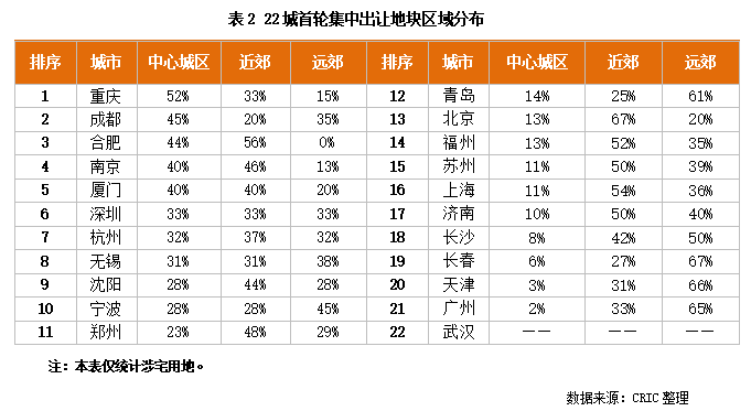 而在供地結(jié)構(gòu)方面,除重慶、成都等少數(shù)城市將供地主力放在中心城區(qū)外,其余城市的供地主力集中在郊區(qū),供應(yīng)量占比基本都在6成以上,中心城區(qū)則僅有少量地塊供應(yīng)。