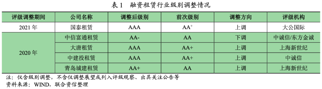 2021年以來,依據公開可查資料,新增1家融資租賃公司(以下分析均不包含金融租賃公司)發生信用等級遷移,即國泰租賃評級發生上調,無新增有公布的評級下調的融資租賃公司。