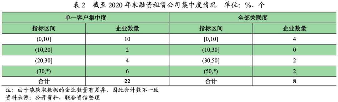 據了解,許多融資租賃公司尚未確定明確的轉型方案,尤其是對于關聯集中度超過50%的融資租賃公司。雖然融資租賃公司可能選擇采用與其他企業交換資產的方式來降低集中度,但未來能否順利施行仍有待觀察。部分融資租賃公司已經開始拓展集團外的業務,由于租賃周期通常在3年以上并且對集團外部業務的風險把控能力有待檢驗,因此短期內集中暴露風險的可能性不大,但在未來的一個租賃周期及經濟周期內仍可能會出現資產質量下降的情況。截至2020年末,公開并且能獲取到客戶集中度數據的融資租賃公司中單一客戶集中度超過30%的有6家;全部關聯度超過50%的有2家。