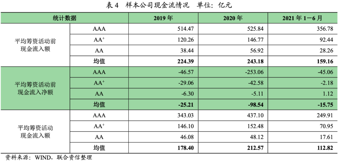 從業務內生現金流來看,2020年,樣本公司平均籌資活動前現金流入額實現同比增長。分結構來看,AAA、AA+和AA級別的樣本公司平均籌資活動前現金流入額均實現了同比增長。2021年上半年,樣本公司平均籌資活動前現金流入額較為平穩,表明樣本公司正常經營產生的現金回流處于較為平穩的狀態。