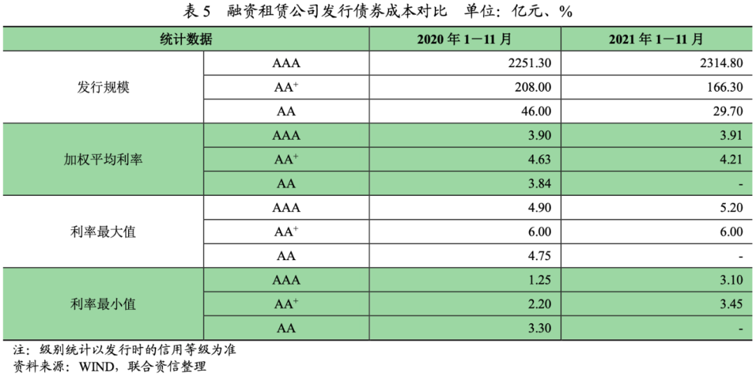 融資租賃公司債券發行成本方面,根據WIND統計,2021年1-11月,AAA和AA+主體發行債券加權平均利率分別為3.91%和4.21%;同期AA主體發行債券均有股東或專業擔保公司對其發行的債券進行擔保,因此AA級別的利率并不能準確反映出投資者對于發行人本身的認可度,在此未計算其加權平均利率。AAA主體發行債券成本較上年同期上升1bp;AA主體發行債券成本較上年同期下降42bp。從利差來看,2021年1-11月,AAA-AA+利差為30bp,較上年同期收縮43bp。