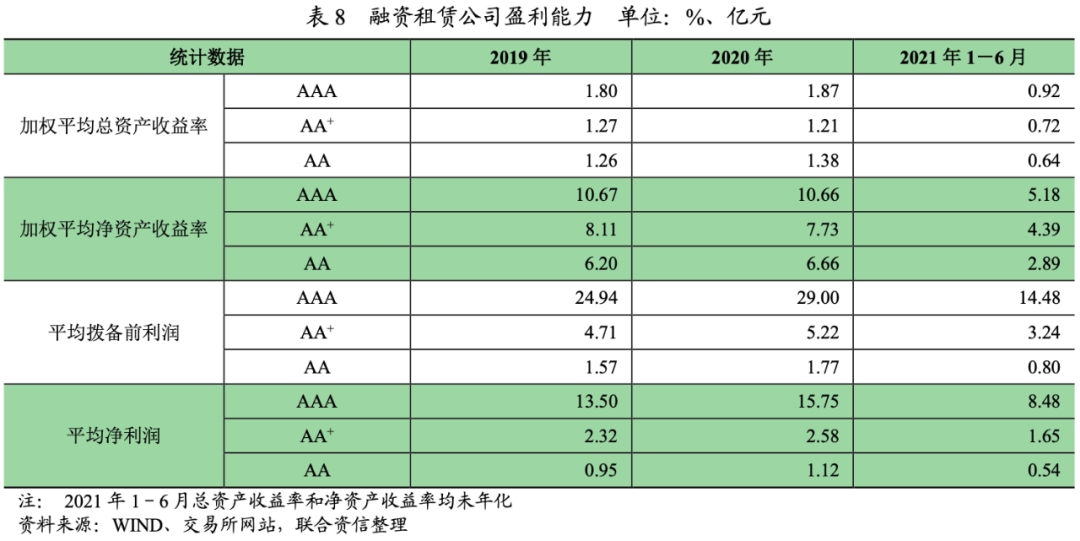 從利潤規模來看,2020年,AAA、AA+和AA級別融資租賃公司的平均撥備前利潤同比增長16.29%、10.74%和12.46%。2020年,AAA、AA+和AA級別融資租賃公司的平均凈利潤同比增長16.71%、10.85%和17.50%,AA級別融資租賃公司平均凈利潤增速最快,增速超過AAA級別融資租賃公司,其中AA級別融資租賃公司計提的減值準備比例較低是原因之一。2021年上半年,AAA、AA+和AA級別融資租賃公司的平均凈利潤同比增長28.51%、33.08%和4.14%,各級別融資租賃公司凈利潤均實現增長,但是增速分化明顯。