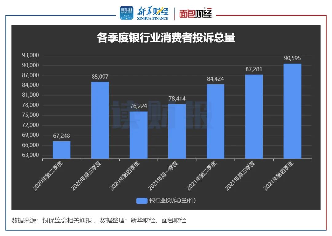 統(tǒng)計數(shù)據(jù)顯示,2021年銀保監(jiān)會處理銀行業(yè)消費投訴340714件。其中,第四季度處理投訴90595件,環(huán)比增長3.8%。2021全年各季度處理投訴量呈現(xiàn)出同比、環(huán)比均逐季增長的趨勢。