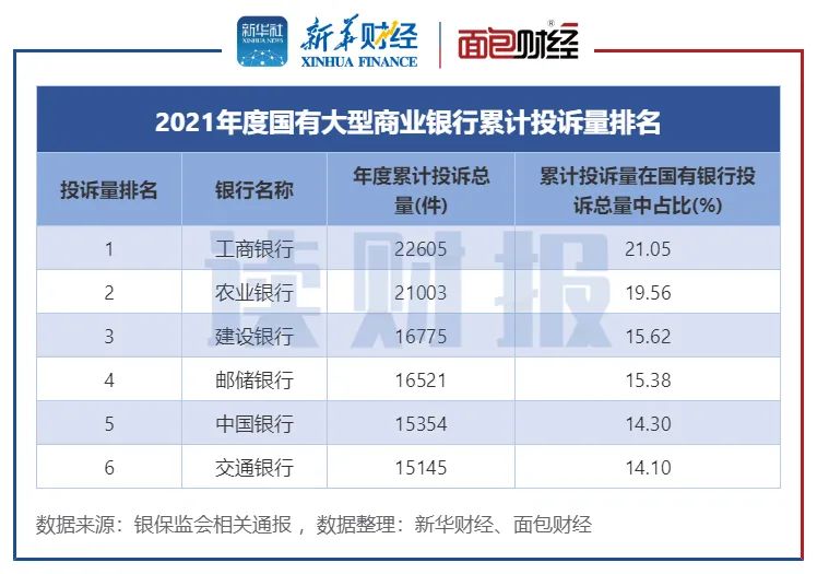 從年度數(shù)據(jù)看,2021全年國有銀行中消費者累計投訴量前三名的分別是工商銀行、農(nóng)業(yè)銀行和建設銀行。