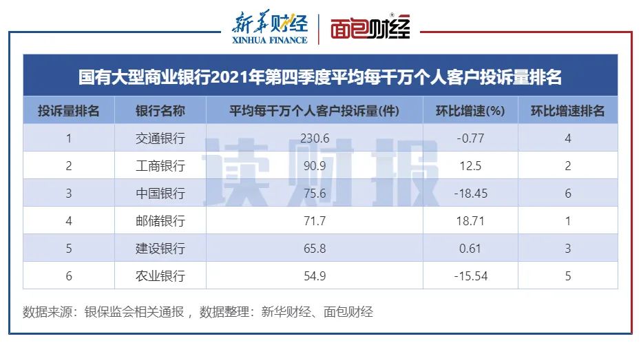 交通銀行2021年第四季度兩項指標均位列國有銀行首位且明顯高于其他國有銀行,顯示出該銀行的相關業(yè)務服務質(zhì)量和消費者權益保護水平亟待提升。