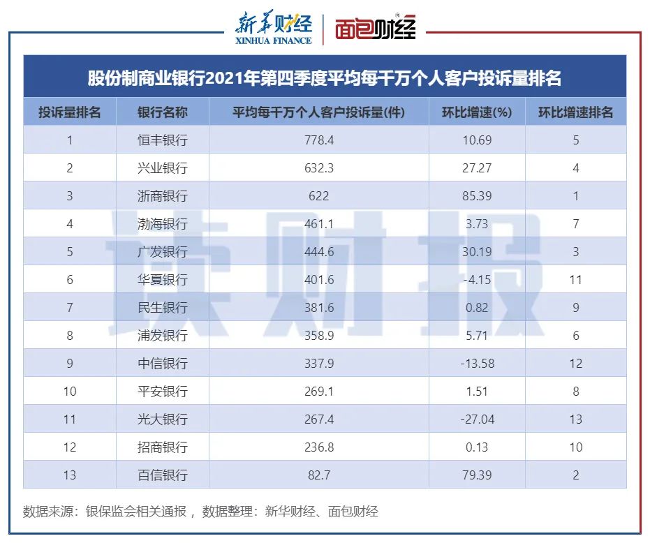 以每千萬個人客戶投訴量排名,2021年第四季度,恒豐銀行、興業(yè)銀行和浙商銀行位居股份制銀行前三名。按照季度環(huán)比增速排名,浙商銀行和百信銀行增長最快。光大銀行環(huán)比下降27.04%,在股份制銀行中降幅最大。