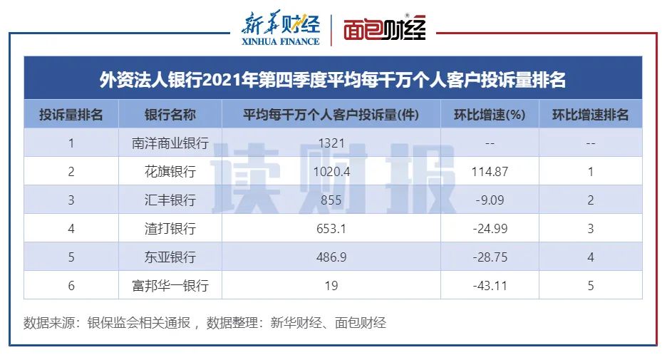 外資法人銀行中,2021年第四季度東亞銀行消費者投訴總量位居榜首,花旗銀行投訴增速最快。