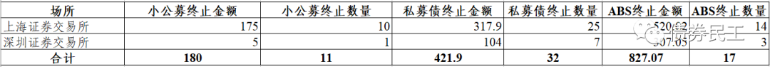 根據上海證券交易所和深圳證券交易所公司債券項目信息平臺的公開信息,2022年3月終止的債券項目(小公募、私募債和ABS)金額合計為1,428.97億元,終止項目數量60個。其中上海證券交易所終止金額為1,012.92億元,占比為70.88%;深圳證券交易所終止金額為416.05億元,占比為29.12%。1575.40億元,