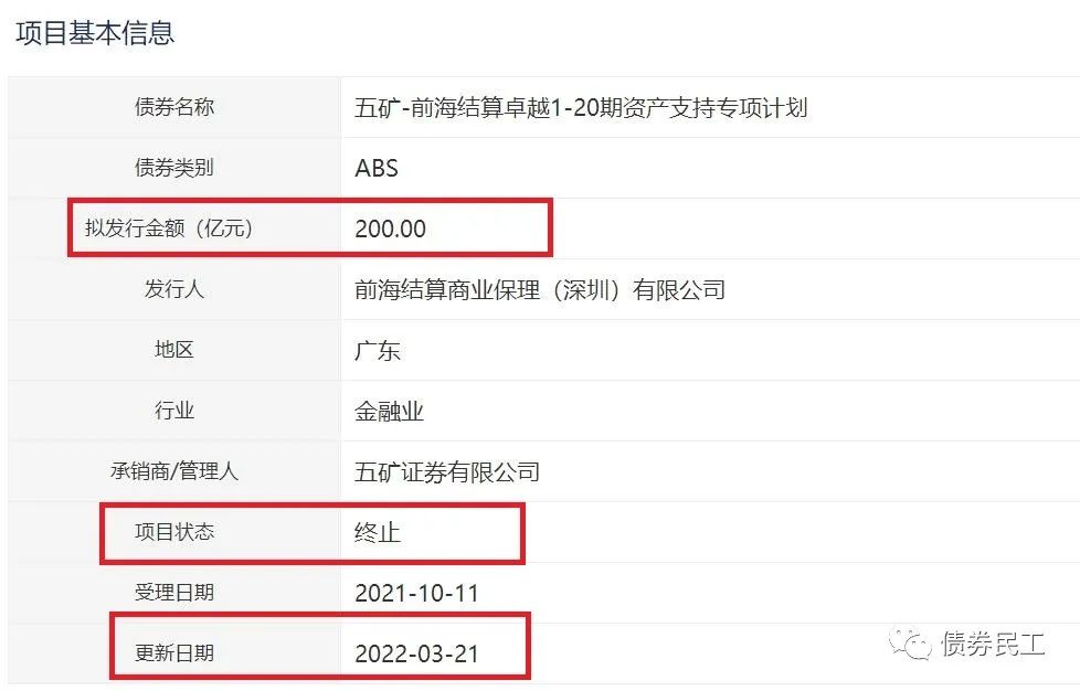 從具體申報產品的規模來看,單只債券終止金額最大的均是ABS產品,其中有4個ABS產品的金額為100億元,1個ABS的產品金額為200億元,均屬于儲架類ABS產品。2022年以來,儲架類ABS產品終止的情況較多。重慶國際信托股份有限公司和廈門國際信托有限公司作為原始權益人申報的擬發行金額為400億元的“華融-新遠1-20期資產支持專項計劃”于2022年1月20日終止。債券民工查詢了一下交易所系統信息,僅在2022年1月就有3只總申報規模超過100億元的ABS產品被終止。而2021年全年被終止的100億元的ABS產品就更多了,僅在上交所終止的產品就有50只。