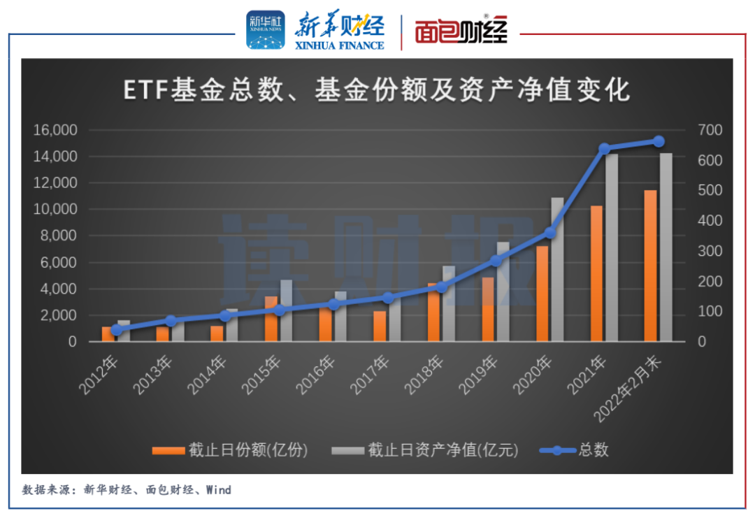 近年來,ETF基金迎來跨越式發展,基金份額于2021年10月突破1萬億份,2022年2月末進一步上升至約1.15萬億份;ETF基金總數則于2021年11月突破600只,2022年2月末達到663只。