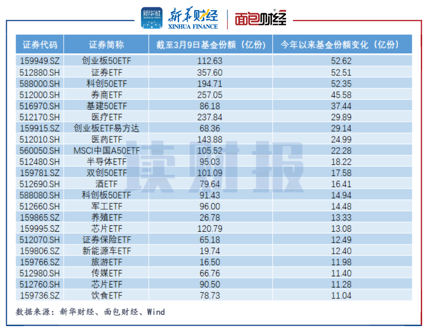 今年以來創業板50ETF、證券ETF等份額顯著增長 上證50ETF下降最多