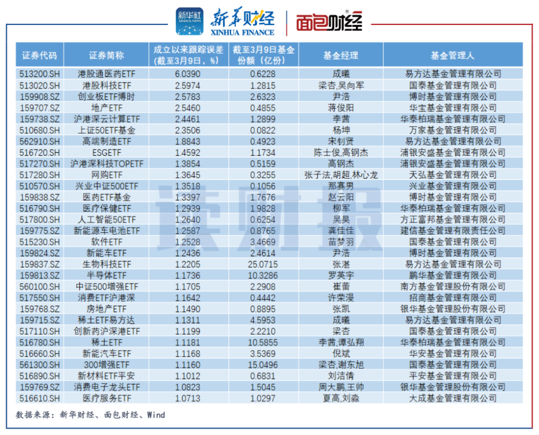 除了港股通醫藥ETF,港股科技ETF、創業板ETF博時、地產ETF、滬港深云計算ETF、上證50ETF基金這5只產品成立以來的跟蹤誤差也超過了2%。基金份額超過10億份的ETF基金中,生物科技ETF、半導體ETF、稀土ETF、300增強ETF的跟蹤誤差較高。