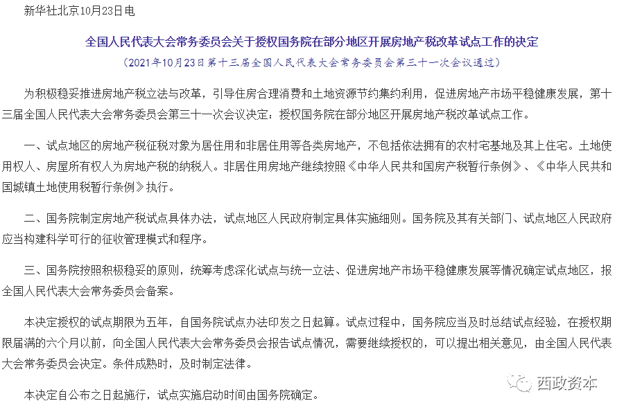 2021年10月23日,第十三屆全國人大常委會(huì)第三十一次會(huì)議作出決定,授權(quán)國務(wù)院在部分地區(qū)開展房地產(chǎn)稅改革試點(diǎn)工作。