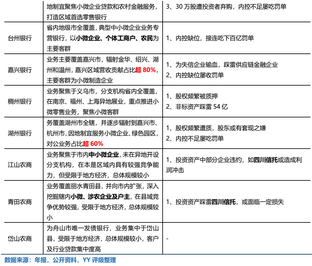 由于浙江的塊狀經(jīng)濟(jì)屬性,樣本行之間表現(xiàn)出差異化特征,上述四個維度分化較大。資產(chǎn)投向方面,有親基建的杭州銀行、有親零售的寧波銀行、亦有親租賃和商務(wù)服務(wù)的通商銀行……但他們都奠基于民營經(jīng)濟(jì),深耕小微客戶。資產(chǎn)質(zhì)量方面,部分銀行不良雖有抬頭傾向,但隨著不良處置力度加大,區(qū)域不良將仍較為可控。盈利能力方面,有盈利翹楚的臺州銀行,有優(yōu)等生寧波銀行,亦有吊車尾的溫州銀行,本地經(jīng)濟(jì)稟賦固然是決定盈利的重要因素,差異化經(jīng)營策略亦是制勝關(guān)鍵。資本充足性方面,樣本行均距監(jiān)管標(biāo)準(zhǔn)有一定安全邊際,高位撥備或能實現(xiàn)區(qū)域跨越周期。