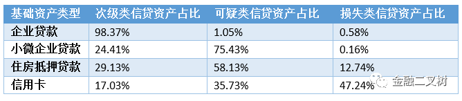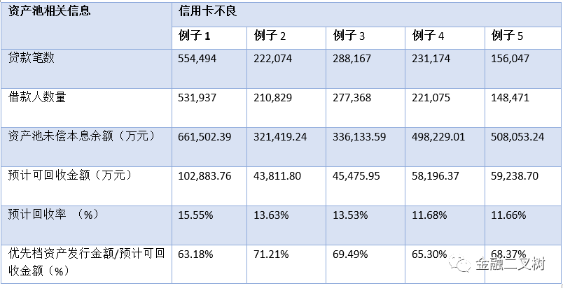 不良ABS根據(jù)基礎資產(chǎn)不同可以分為信用卡類、企業(yè)貸款類、小微企業(yè)貸款類、住房抵押貸款類、個人汽車貸款類、一般消費貸款類和混合貸款類。在這幾種資產(chǎn)中信用卡類是被認為分散度最高的,這是由于信用卡類客戶以及貸款性質(zhì)決定的,這類ABS入池貸款筆數(shù)相較其他類ABS是最多的,每筆規(guī)模也普遍較小,以下表為例: