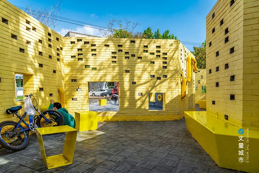 灰磚和暖黃鋪裝在色彩上碰撞融合,剛硬的底色上傳達出了溫暖和樂觀的感覺,也與公園內的法桐樹、銀杏樹遙相呼應,深秋葉黃,必是一番好景致。穿孔灰色墻磚又與穿孔耐候鋼、不銹鋼雕塑交替組合,則在構件上實現了傳統與現代交融的層次感。