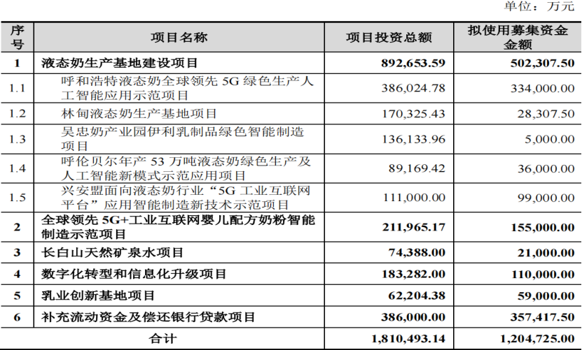 其中液態奶建設共計使用50.23億(占比41.7%),分布在呼和浩特、林甸、吳忠、呼倫貝爾、興安盟5個生產基地。
