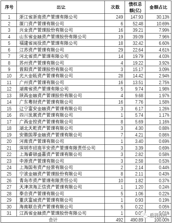 有非本省地方AMC投資記錄的省市高達(dá)14個(gè),其中北京由于銀行總部因數(shù),市場(chǎng)占比最高;福建市場(chǎng),由于浙商資產(chǎn)的重倉(cāng),是所有省份里被域外地方AMC收購(gòu)金額最多的;湖北、廣西、四川這3個(gè)中西部省份,由于市場(chǎng)價(jià)格、環(huán)境、流動(dòng)性等多方面因素,受到了多家地方AMC的青睞,市場(chǎng)占比較高;而山東、浙江等成熟的不良資產(chǎn)市場(chǎng)大省,由于市場(chǎng)競(jìng)爭(zhēng)激烈,價(jià)格高昂,雖然參與的地方AMC較多,但市場(chǎng)存在感不高。