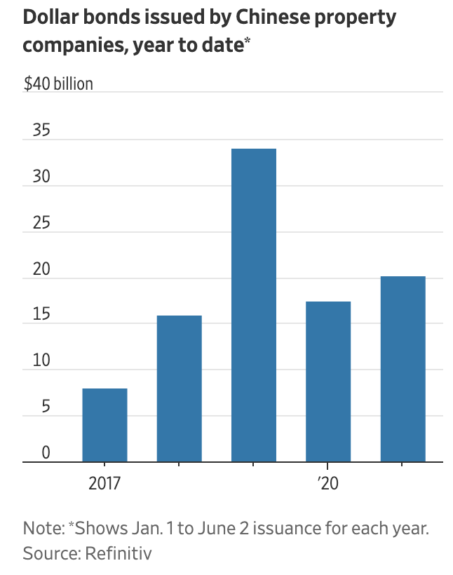 據(jù)Refinitiv數(shù)據(jù)顯示,2021年前五個月中國房地產公司已經發(fā)行203億美元的債券,較去年同期增長16%,在過去五年同期比較中僅次于2019年。高收益?zhèn)耐顿Y者競爭認購中資地產美元債,仿佛對正在發(fā)生的商票逾期、個體違約、樓市調控趨嚴都視若罔聞。