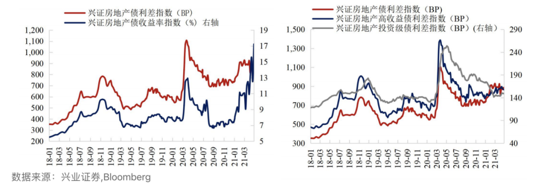 今年以來,興證房地產債利差指數(shù)闊升至過去三年來的次高水平,僅次于2020年3月美元荒,結構上主要受到高收益級(垃圾債)利差走闊的抬升。信用利差是債券到期收益率高于無風險收益率的部分,直觀地反映了債券信用違約風險(與利差正比)及市場風險偏好(與利差反比)的變化。