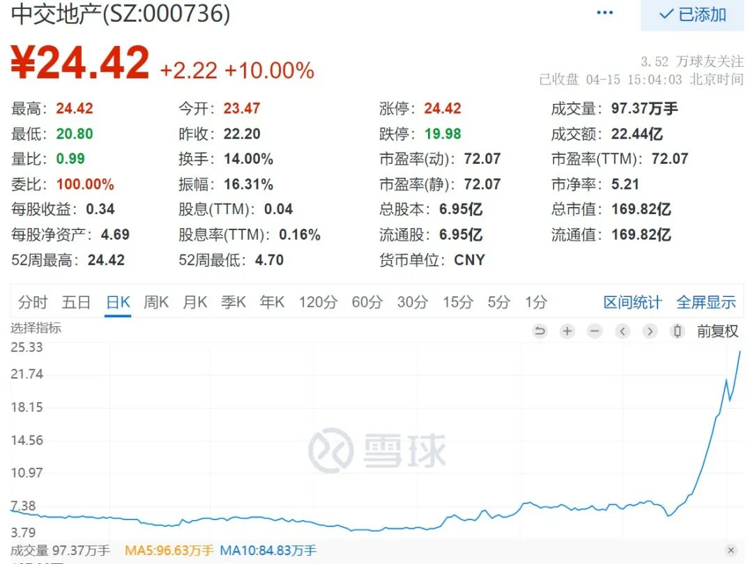 2022年第一個(gè)堪稱“妖股”的地產(chǎn)股——中交地產(chǎn)(000736.SZ)已經(jīng)“瘋狂”了一個(gè)月。