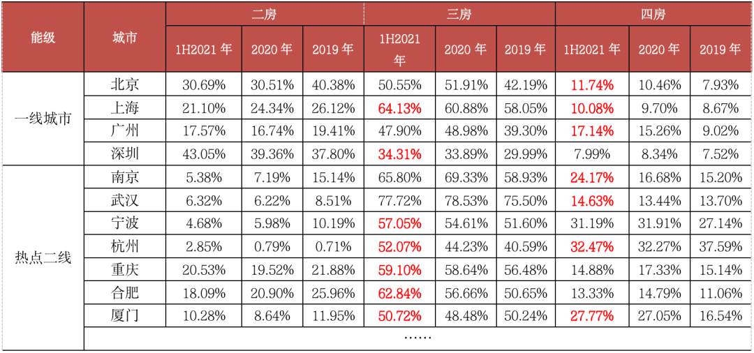 一線城市三房、四房占比持續提升。2021年上半年,一線城市三房戶型成交占比50.11%,較2020年再增0.8個PTS;四房成交占比12.44%,較2020年再增0.71個PTS。