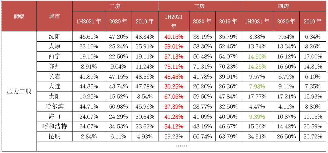 數據來源:CRIC中國房地產決策咨詢系統表:部分二線城市普通住宅二房、三房、四房成交套數占比