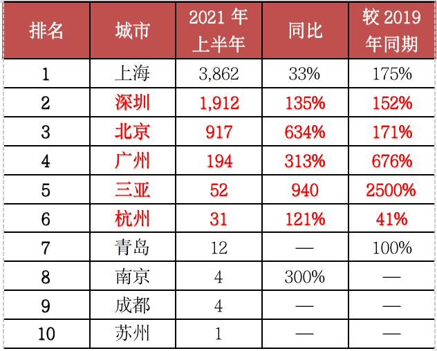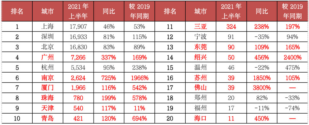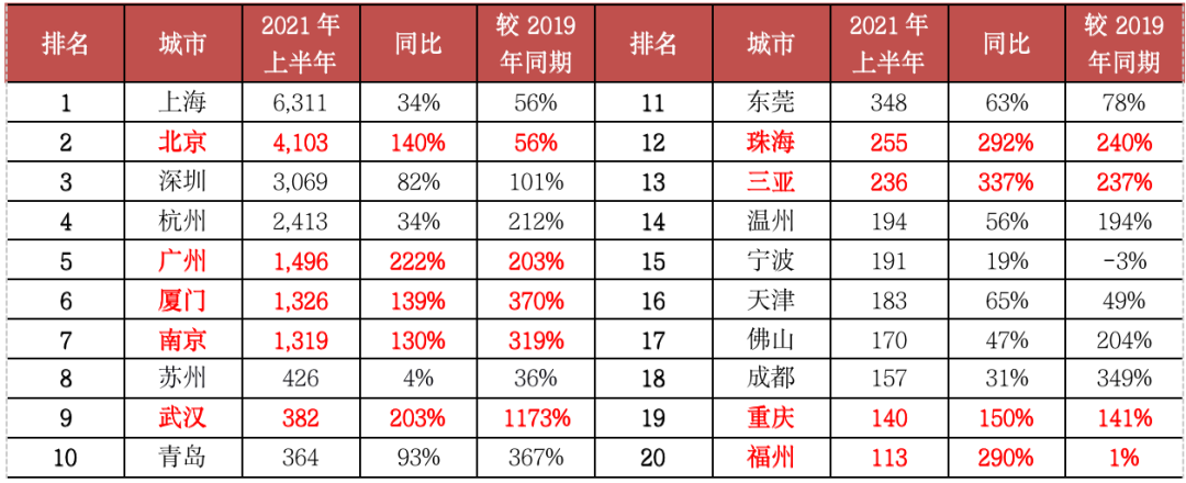 表:2021年上半年單價5萬元/平方米以上豪宅成交套數TOP20城市(單位:套) 數據來源:CRIC中國房地產決策咨詢系統
