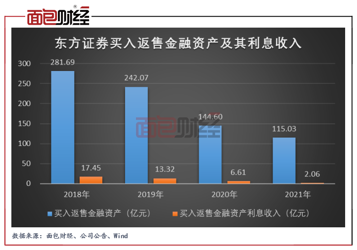 2018年以來,東方證券或出于控制信用風(fēng)險(xiǎn)的考量,持續(xù)縮減了買入返售金融資產(chǎn)的規(guī)模,從而導(dǎo)致買入返售金融資產(chǎn)利息收入逐年下降。但由該資產(chǎn)產(chǎn)生的減值損失卻未見明顯跌勢。2020年和2021年,買入返售金融資產(chǎn)分別產(chǎn)生減值損失36.96億元和13.18億元,均高于2018年和2019年發(fā)生的金額。