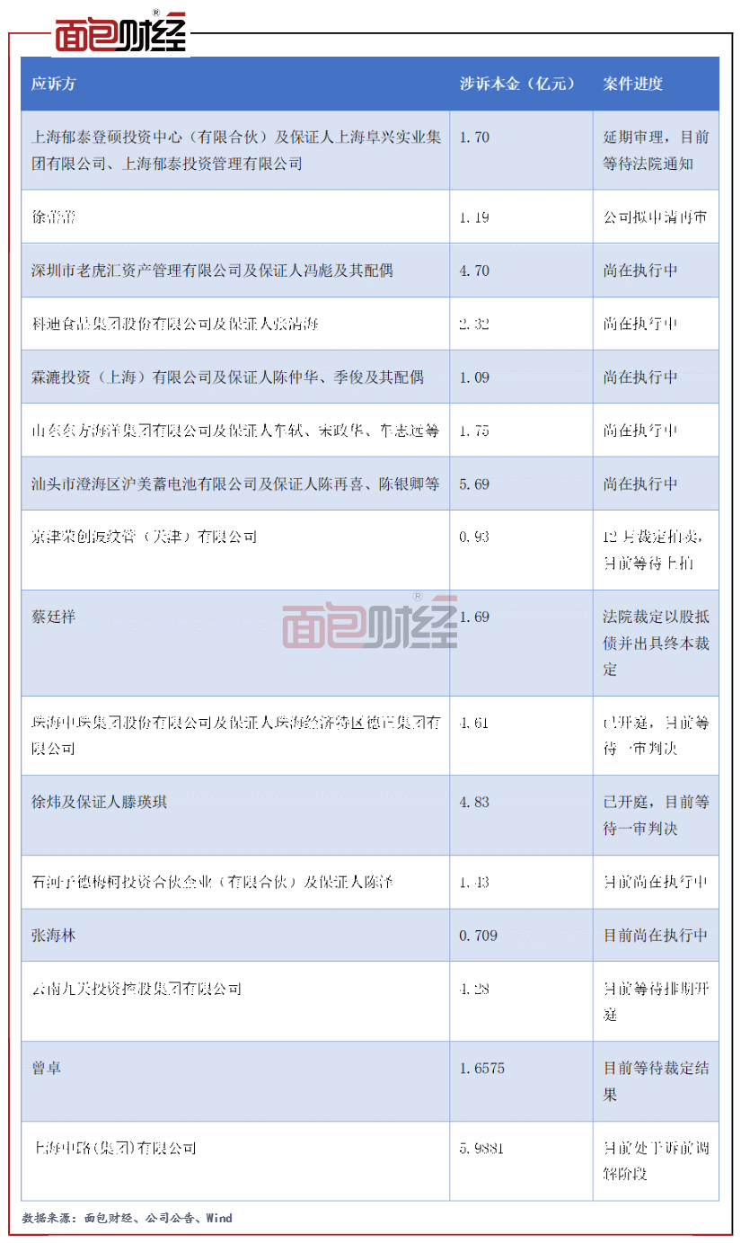 其中,公司與汕頭市澄海區(qū)滬美蓄電池有限公司、珠海中珠集團(tuán)股份有限公司、徐煒和云南九天投資控股集團(tuán)有限公司發(fā)生訴訟的本金金額均超過4億元,而對(duì)應(yīng)質(zhì)押式回購業(yè)務(wù)的標(biāo)的股票分別為*ST猛獅、ST中珠、*ST騰信和*ST易見,均面臨一定交易風(fēng)險(xiǎn)。