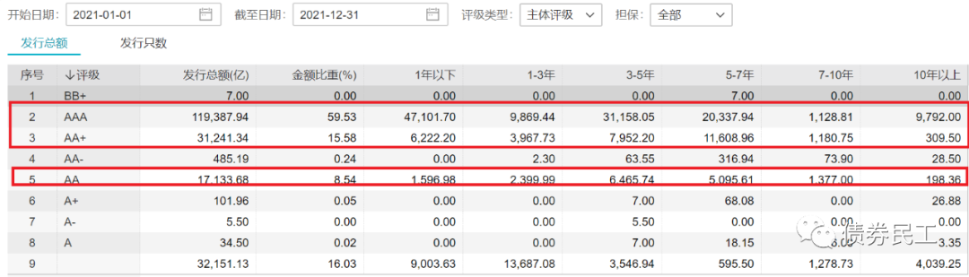 根據信用評級情況對信用債券發行數據進行分類,可以明確看出,AAA、AA+和AA發行人的主體信用等級、發行人數量和債券發行數量呈現了明顯的負相關關系,主體信用等級越高,發行人的數量越少,但是債券發行金額越高。以2021年為例,AA發行人的發行金額在2021年占比只有8.54%,而AAA發行人的發行金額在2021年占比則高達59.53%。
