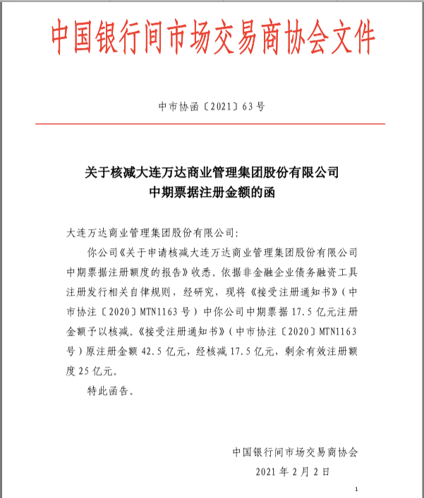 一個星期前,銀行間交易商協(xié)會函告萬達商業(yè),其申請核減中期票據(jù)17.5億元注冊額度已被批準。