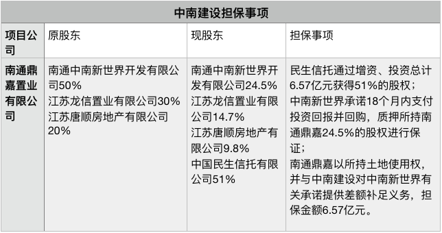 南通鼎嘉質(zhì)押其土地,并與中南建設對南通新世界的承諾提供差額補足義務,擔保額度與民生信托投資額度相等。