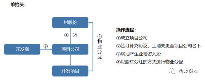單抬頭的操作模式比較簡單,規(guī)劃和自然資源部(原為規(guī)劃國土委)與村股份公司簽訂《土地出讓合同》后,規(guī)自局、村股份公司、村股份公司的全資子公司三方簽訂《補充協(xié)議》,將土地使用權(quán)變更至村股份公司的全資子公司名下,然后開發(fā)商通過增資的方式取得原村股份公司的全資子公司的絕大部分股權(quán),項目公司完成開發(fā)建設后向村股份公司(即原100%股權(quán)的控股股東)分配物業(yè),具體如下圖所示。