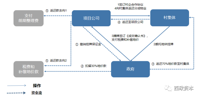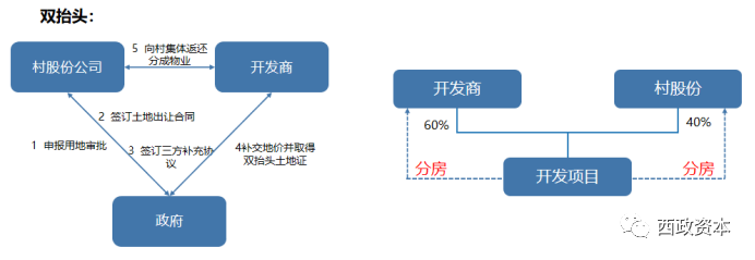需注意的是,單抬頭的合作模式下,因項目公司分配給村股份公司的物業(yè)無法做稅前扣除,因此在土地成本(如非農(nóng)或征返用地的出讓金)很低的情況下綜合稅負就會高很多,另外開發(fā)商完成項目的開發(fā)建設并在分配物業(yè)的過程中,因項目公司分配給村股份公司物業(yè)需按視同銷售處理,因此在土地成本很低的情況下相當于開發(fā)商還要額外掏出現(xiàn)金去繳納分配物業(yè)過程中的巨額稅費,由此就催生了雙抬頭的合作模式。