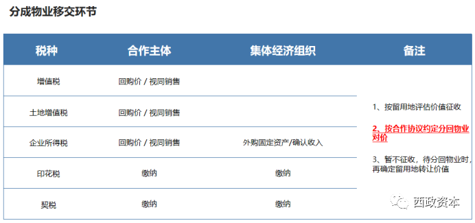 開發(fā)商按照相關(guān)協(xié)議將建成物業(yè)以無償移交的方式給到村集體和村民的情形下,開發(fā)商需就分成物業(yè)按視同銷售繳納增值稅、土地增值稅及企業(yè)所得稅等,計稅依據(jù)按照留用地轉(zhuǎn)讓時點分成物業(yè)的約定價值(或市場評估價值)。村集體和村民主要繳納契稅、印花稅,其中村集體還需繳納企業(yè)所得稅,根據(jù)《國家稅務總局關(guān)于印發(fā)〈房地產(chǎn)開發(fā)經(jīng)營業(yè)務企業(yè)所得稅處理辦法〉的通知》(國稅發(fā)〔2009〕31號)第三十七條規(guī)定:以換取開發(fā)產(chǎn)品為目的,將土地使用權(quán)投資其他企業(yè)房地產(chǎn)開發(fā)項目的,應在首次取得開發(fā)產(chǎn)品時,將其分解為轉(zhuǎn)讓土地使用權(quán)和購入開發(fā)產(chǎn)品兩項經(jīng)濟業(yè)務進行所得稅處理,并按應從該項目取得的開發(fā)產(chǎn)品(包括首次取得的和以后應取得的)的市場公允價值計算確認土地使用權(quán)轉(zhuǎn)讓所得或損失。另根據(jù)《中華人民共和國企業(yè)所得稅法實施條例》第五十八條規(guī)定,非貨幣性資產(chǎn)交換取得的固定資產(chǎn),以該資產(chǎn)的公允價值和支付的相關(guān)稅費為計稅基礎。開發(fā)商和村集體確認的資產(chǎn)公允價值應保持一致。