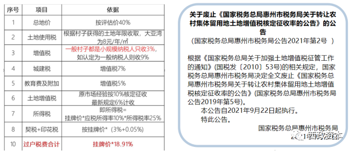 有個問題需要特別留意,在留用地掛牌轉(zhuǎn)讓的過程中,村集體需按土地使用權(quán)的轉(zhuǎn)讓繳納各種稅費,其中先前的土地增值稅核定征收率已在2021年9月22日廢止(詳見下圖)。