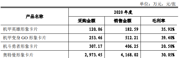 招股書顯示,2020年度華立科技賣出了4168.02萬人民幣的奧特曼卡片,毛利率高達(dá)30%,占總類目的63.24%。相比之下,龍珠卡、機甲變身Go卡、機斗勇者卡、寶可夢卡、機甲英雄卡等其他IP的卡片分別賣出630.22萬、512.21萬、406.25萬、391.27萬和182.59萬元,僅僅是奧特曼卡片的十分之一乃至零頭。