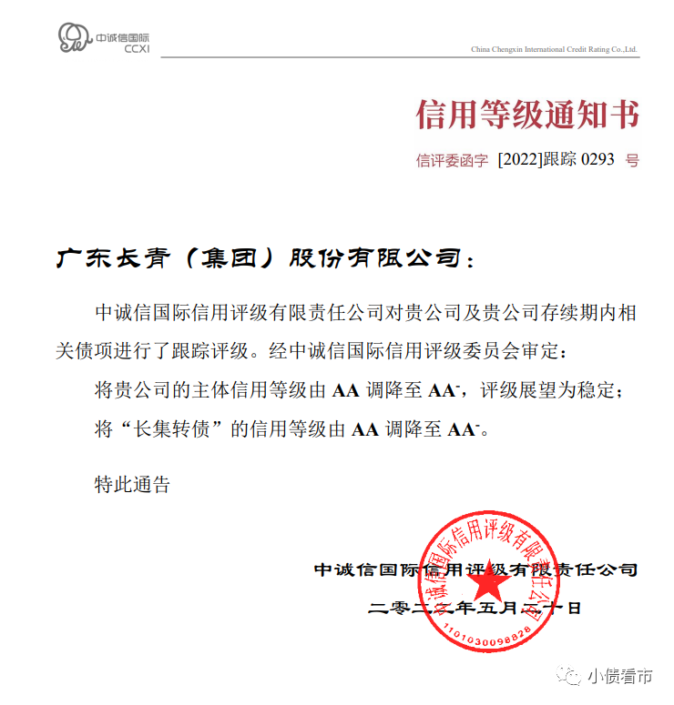 5月24日,中誠(chéng)信國(guó)際公告稱,將長(zhǎng)青集團(tuán)(002616.SZ)主體信用等級(jí)由AA調(diào)降至AA-,評(píng)級(jí)展望為穩(wěn)定,并將“長(zhǎng)集轉(zhuǎn)債”的債項(xiàng)信用等級(jí)由AA調(diào)降至AA-。