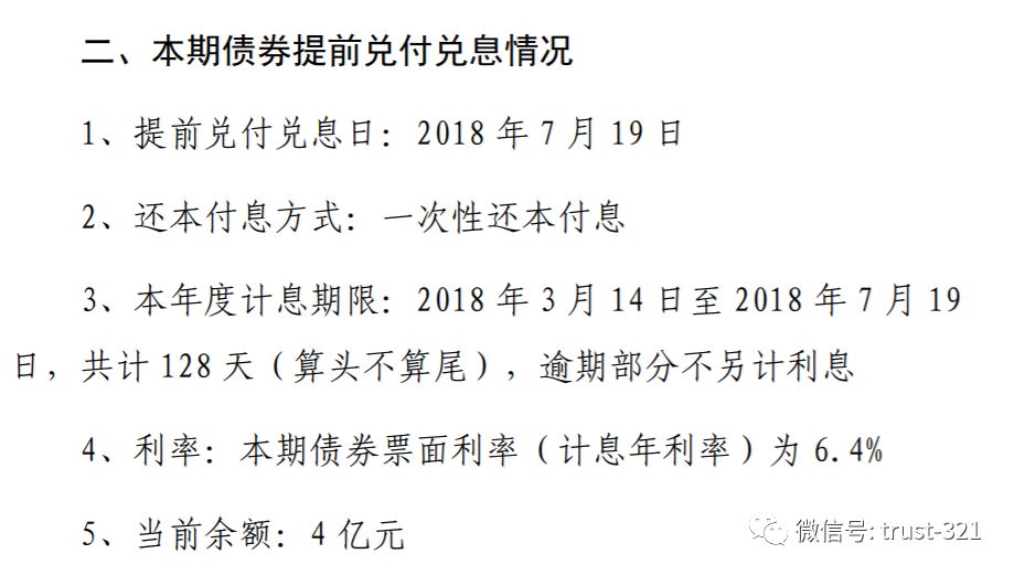 其次是債券提前償還。銀象350盡調資料中提到,融資人2013年4月發行了10億公司債券,該債券期限7年,本應晚于信托到期日;但該債券在2018年7月提前兌付且在7月19日摘牌,導致實際上的償還日早于信托到期日。