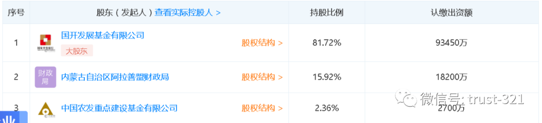 一次是2017年12月,股東由阿拉善盟財政局100%持股,變成了目前的三家持股,國開發展基金有限公司出資9.34億,成為第一大股東: