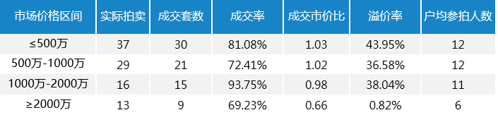 根據(jù)上述統(tǒng)計(jì),95套住宅中在500萬(wàn)內(nèi)這個(gè)價(jià)格區(qū)間房源最多為37套,占本月實(shí)際上拍房產(chǎn)的38.95%,成交市價(jià)比超過(guò)1。本月法拍住宅火熱程度不減,除市價(jià)高于20000萬(wàn)的房產(chǎn),成交都接近市價(jià)或高于市價(jià),這種現(xiàn)象一是表明法拍房接受度更高,法院執(zhí)行情況更好,其次是法拍稅費(fèi)單一相比還是更具有價(jià)格優(yōu)勢(shì)。綜上三月的折扣率偏高與上拍量及房屋質(zhì)量有很大關(guān)系。