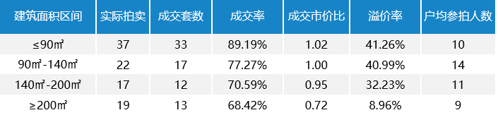根據(jù)上述統(tǒng)計(jì),95套住宅中在≤90㎡這個(gè)價(jià)格區(qū)間房源最多為37套,成交率最高,折扣率為1,表明小戶(hù)型不論在法拍市場(chǎng)還是二手房市場(chǎng)都占有較大優(yōu)勢(shì)。溢價(jià)率最低的是≧200㎡的房產(chǎn),表明上拍房產(chǎn)多成交活躍度低,溢價(jià)率最高的為≦90㎡的房產(chǎn),這是由于中小戶(hù)型房屋一直是人們的不二選擇,也由于眾多學(xué)區(qū)房隸屬的區(qū)域中小戶(hù)型偏多。