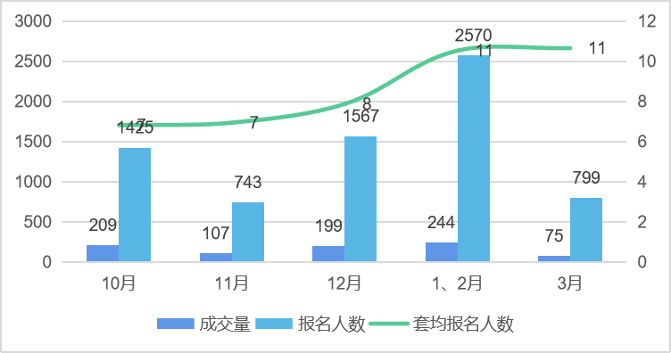“近半年成交量,報(bào)名人數(shù),套均報(bào)名人數(shù)趨勢(shì)圖”