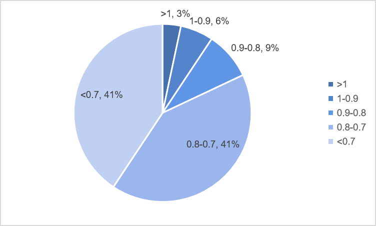 截止至2020年3月31日,北京地區(qū)4月上拍的法拍房數(shù)量為150套,房屋總價(jià)值為123412.259 萬(wàn)元,150套房子的起拍市價(jià)比分布圖如下: