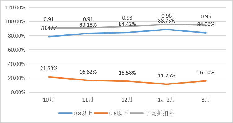 近半年成交市價(jià)比在0.8以下的占比最高的是10月,最低的是1、2月。平均折扣率最高的是在1、2月,為96折,3月平均折扣率依然很高與1、2月持平。