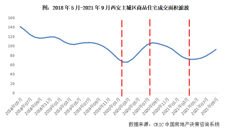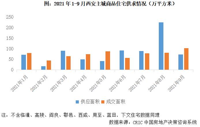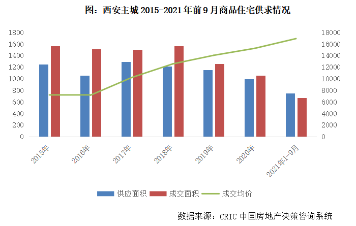 2021年以來,在“330”、“830”兩次調(diào)控加碼之下,西安樓市總體保持平穩(wěn)運(yùn)行,受制于供應(yīng)縮量,成交相較往年有所回調(diào)。前9月,西安主城區(qū)商品住宅供應(yīng)面積752萬平方米,同比微升5%,較2019年同期下降9%,成交面積674萬平方米,同比下降9%,較2019年同期下降29%。