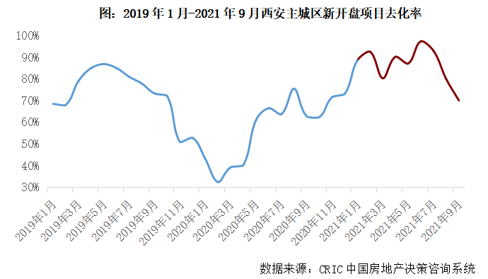 微觀層面,項(xiàng)目銷售表現(xiàn)仍然亮眼,去化率升至近三年來高位。前9月,西安主城區(qū)新開盤項(xiàng)目平均去化率高達(dá)88%,較2020、2019年同期分別增長31個(gè)百分點(diǎn)和6個(gè)百分點(diǎn),2、6、7月等月份去化率皆在95%左右,意味著當(dāng)月新入市項(xiàng)目基本都實(shí)現(xiàn)開盤即罄。